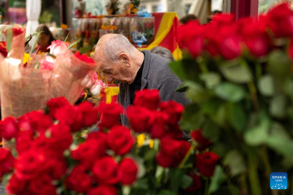 A worker prepares roses for sale at a stall in Barcelona, Spain, April 23, 2023. People give books and roses to celebrate the day of Sant Jordi, patron saint of Catalonia. (Photo by Joan Gosa/Xinhua)