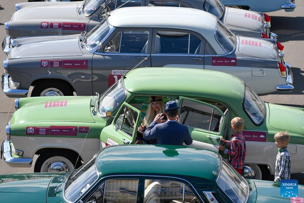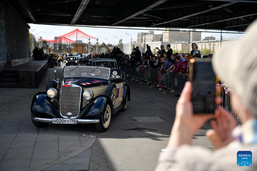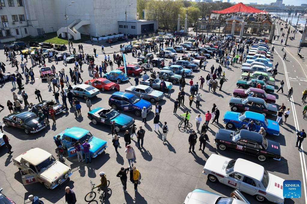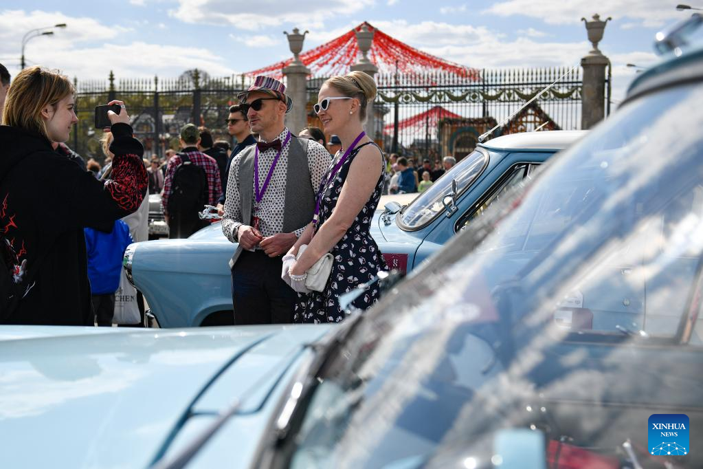 People look at retro cars during the "Stolitsa" retro car rally in Moscow, Russia, on April 23, 2023. (Photo by Alexander Zemlianichenko Jr/Xinhua)