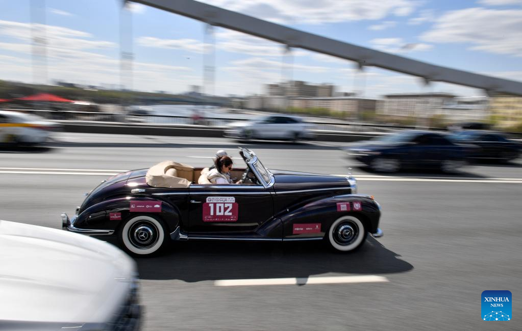 A retro car is pictured during the "Stolitsa" retro car rally in Moscow, Russia, on April 23, 2023. (Photo by Alexander Zemlianichenko Jr/Xinhua)