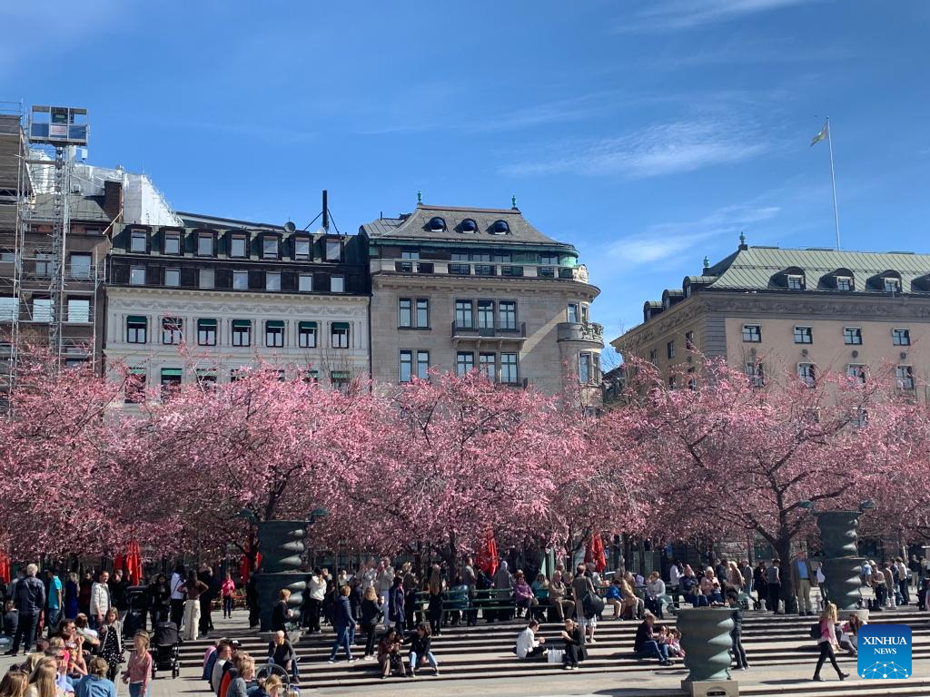 People spend leisure time under blooming cherry trees at the King's Garden in central Stockholm, Sweden, April 23, 2023. (Photo by Fang Ming/Xinhua)