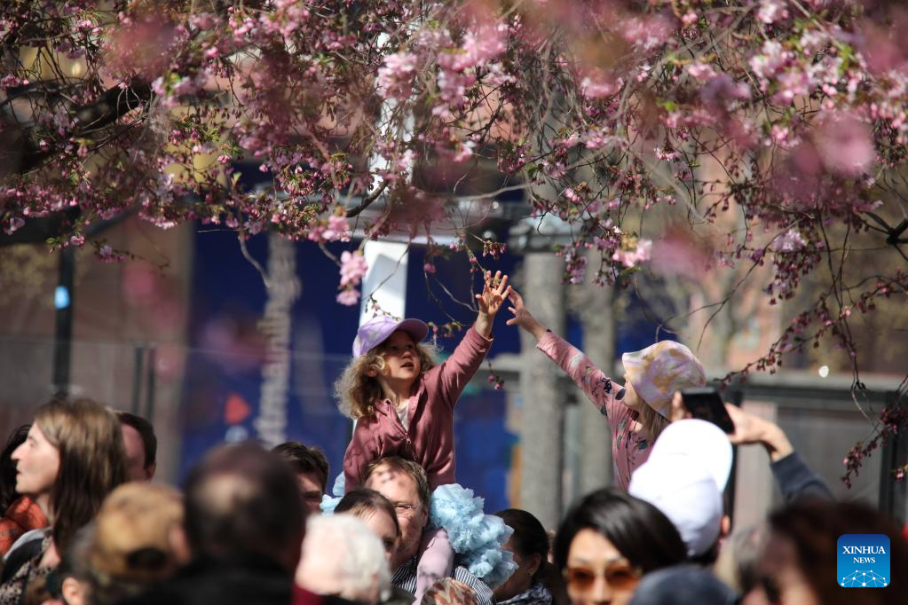 People take photos of cherry blossoms at the King's Garden in central Stockholm, Sweden, April 23, 2023. (Photo by Fang Ming/Xinhua)