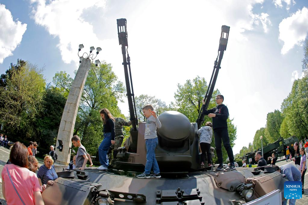 Children have fun on an armoured vehicle at a static exhibition of military equipment marking Romanian Land Forces Day at a park in Bucharest, capital of Romania, April 23, 2023. (Photo by Cristian Cristel/Xinhua)