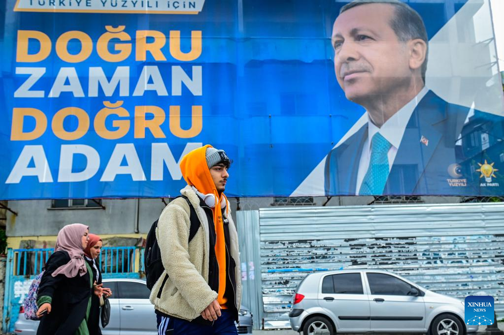 People walk past an election campaign poster in Istanbul, Türkiye, May 5, 2023. As the upcoming Turkish presidential and parliamentary elections on May 14th are less than two weeks away, an army of canvassing volunteers is out in Istanbul's streets, trying their best to woo a vote from 11.3 million eligible voters living in Türkiye's largest city. (Photo by Omer Kuscu/Xinhua)