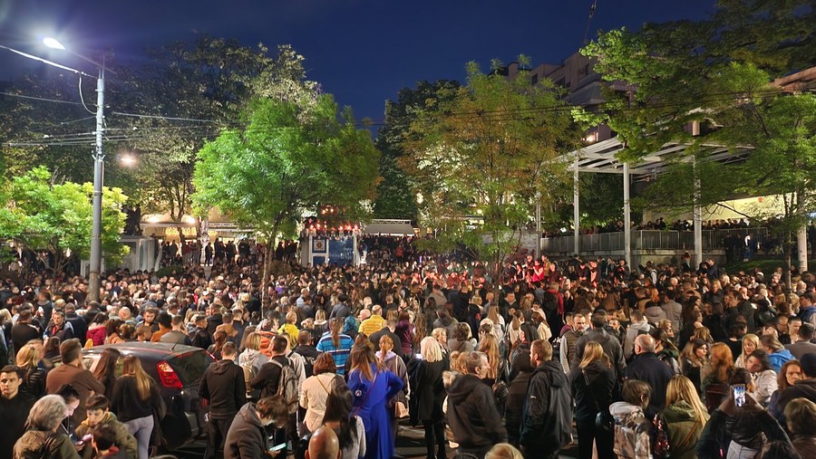 People gather near the site of a school shooting in Belgrade, Serbia, on May 3, 2023. (Photo by Nemanja Cabric/Xinhua)