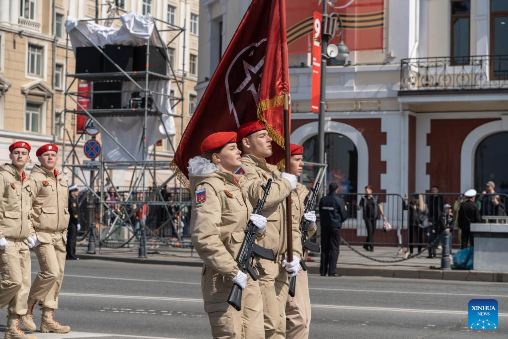 A rehearsal for this year's Victory Day military parade to mark the 78th anniversary of the Soviet Union's victory in the Great Patriotic War is held in Vladivostok, Russia, May 7, 2023. (Photo by Guo Feizhou/Xinhua)
