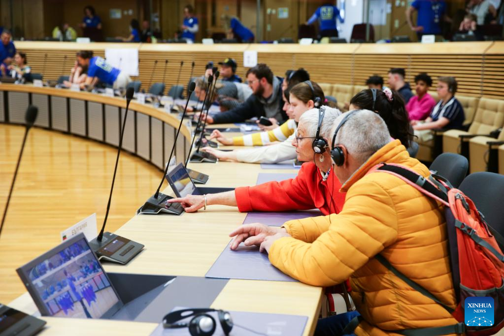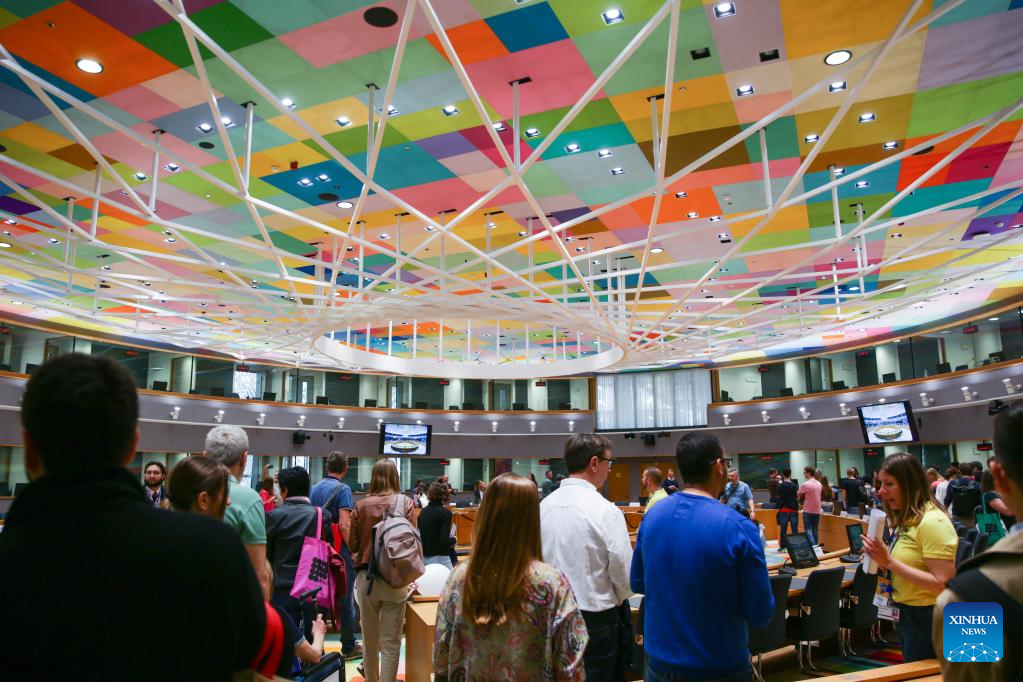 People visit a conference room of the building of the Council of the European Union during the Open Day of the European institutions in Brussels, Belgium, May 6, 2023. The open day is an opportunity for the public to discover how the European institutions operate. Visitors have free access to the institutions' buildings and some special introductory activities. (Xinhua/Zheng Huansong)