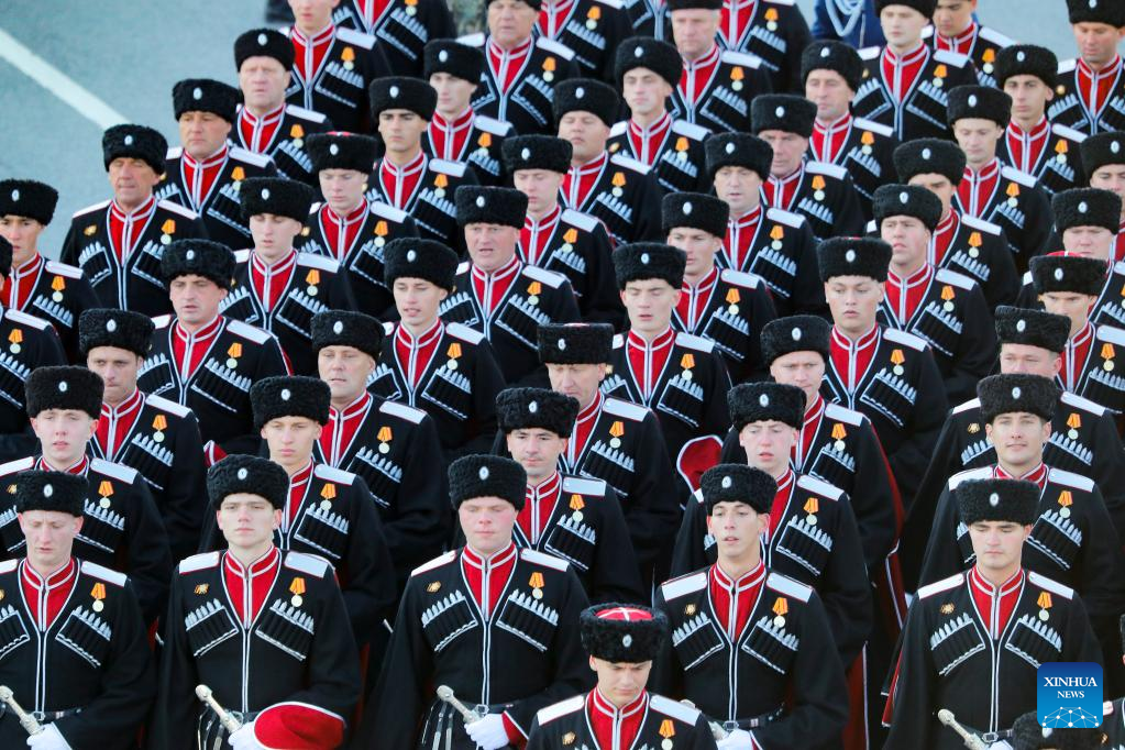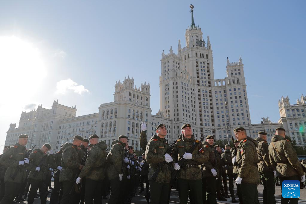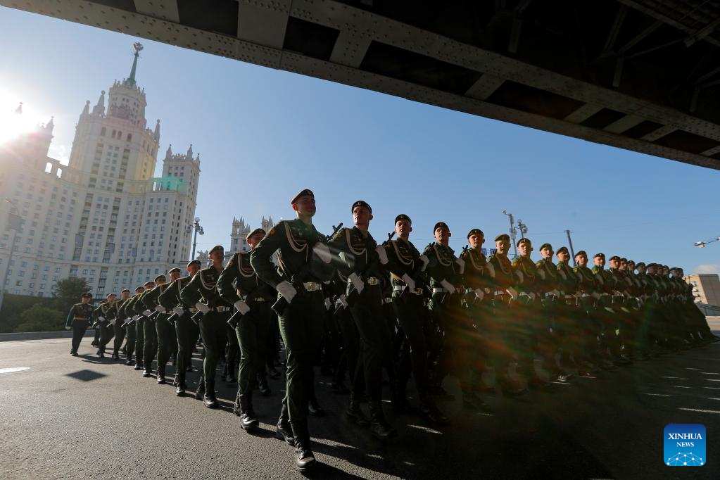 Russian soldiers prepare to attend a rehearsal of the Victory Day military parade in Moscow, Russia, May 7, 2023. (Photo by Alexander Zemlianichenko Jr/Xinhua)