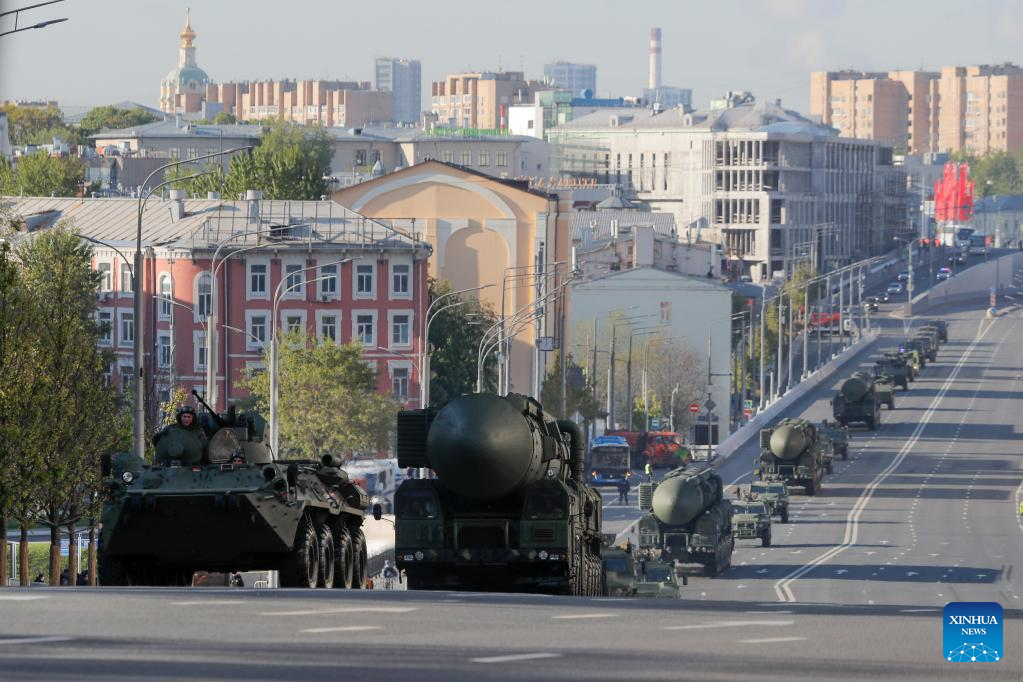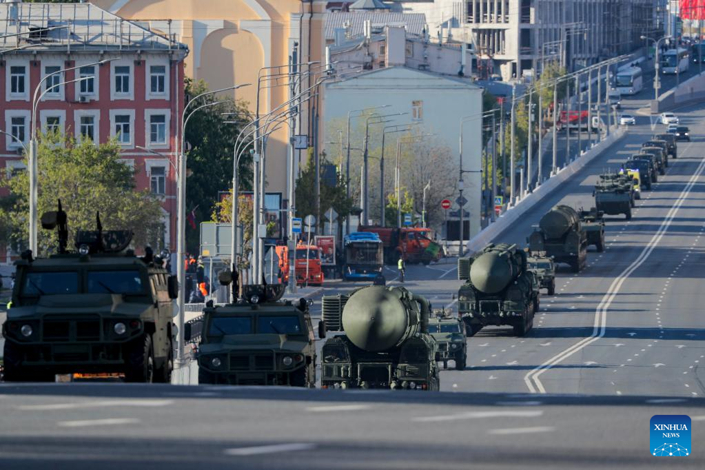 This photo taken on May 7, 2023 shows the Yars ballistic missiles before a rehearsal of the Victory Day military parade in Moscow, Russia. (Photo by Alexander Zemlianichenko Jr/Xinhua)
