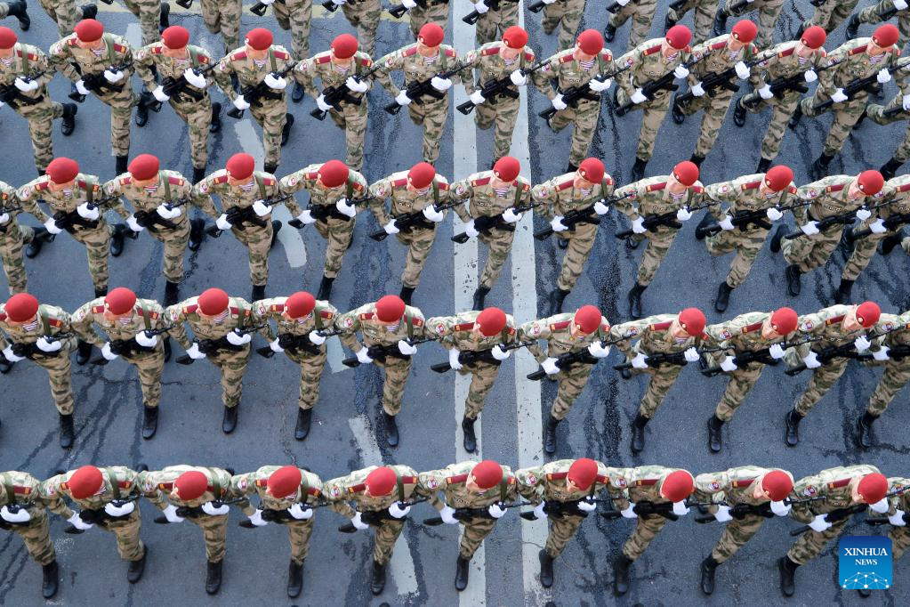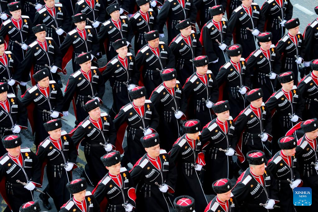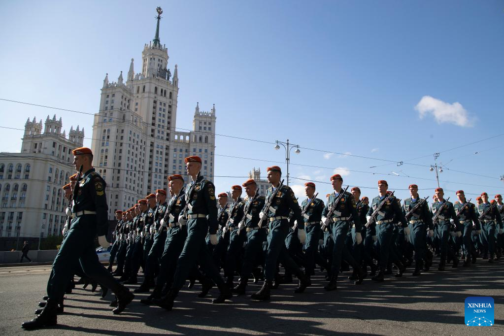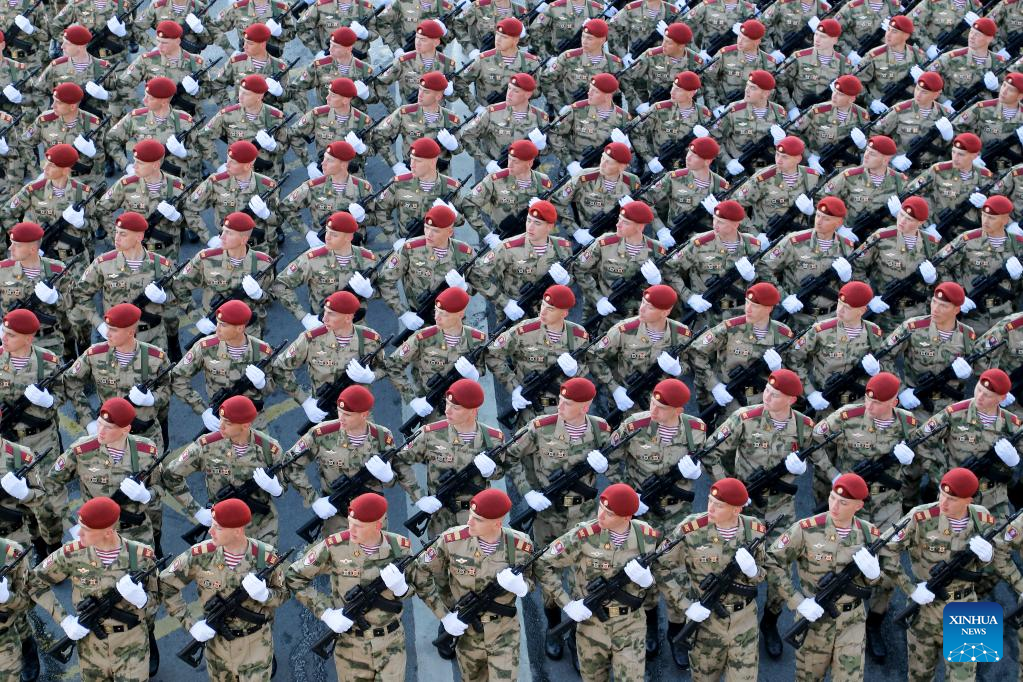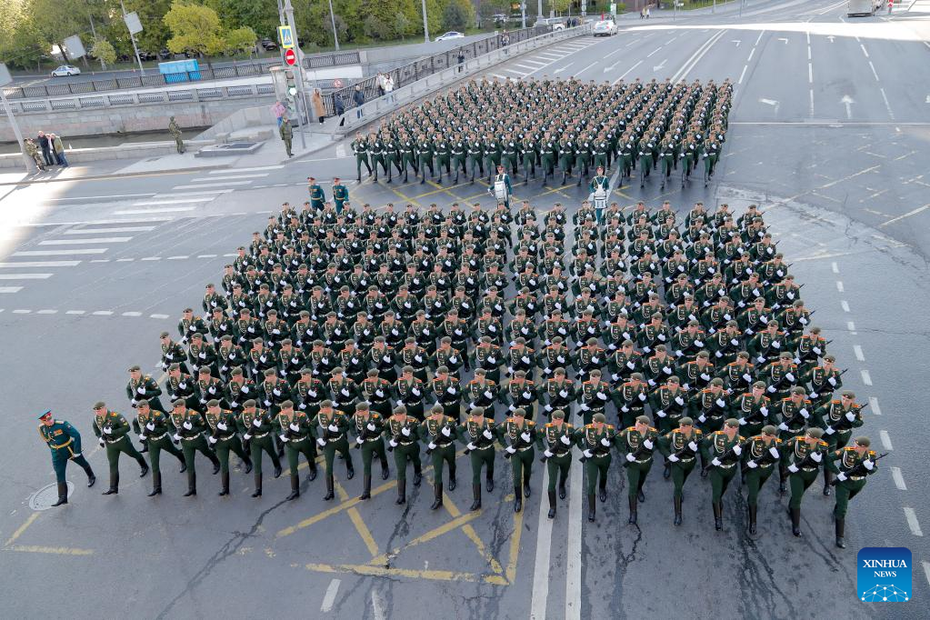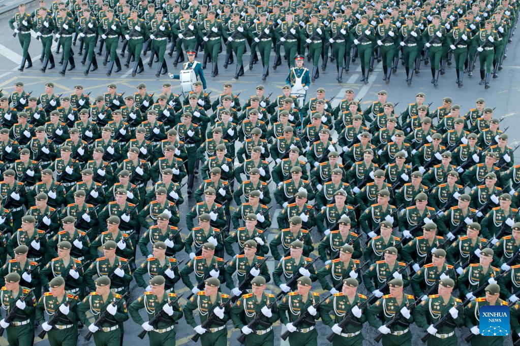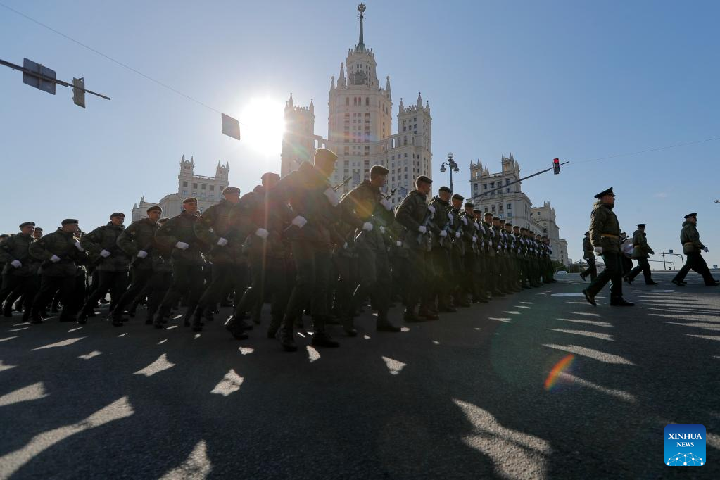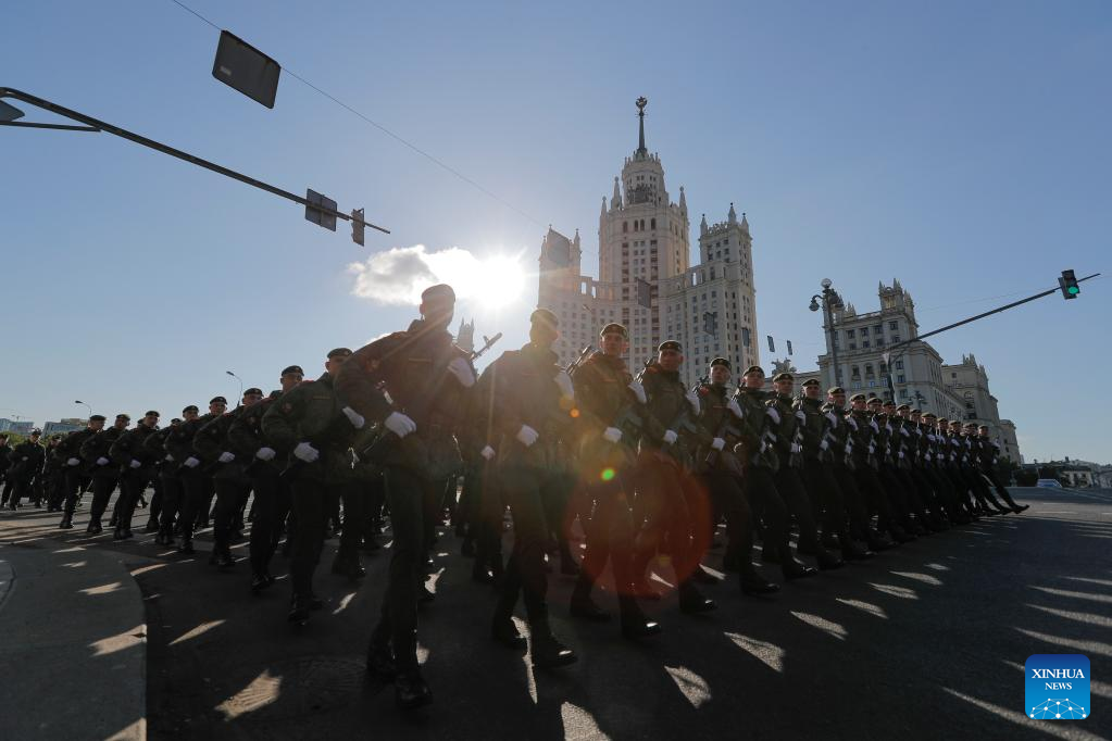 Russian soldiers march during a rehearsal of the Victory Day military parade in Moscow, Russia, May 7, 2023. (Photo by Alexander Zemlianichenko Jr/Xinhua)