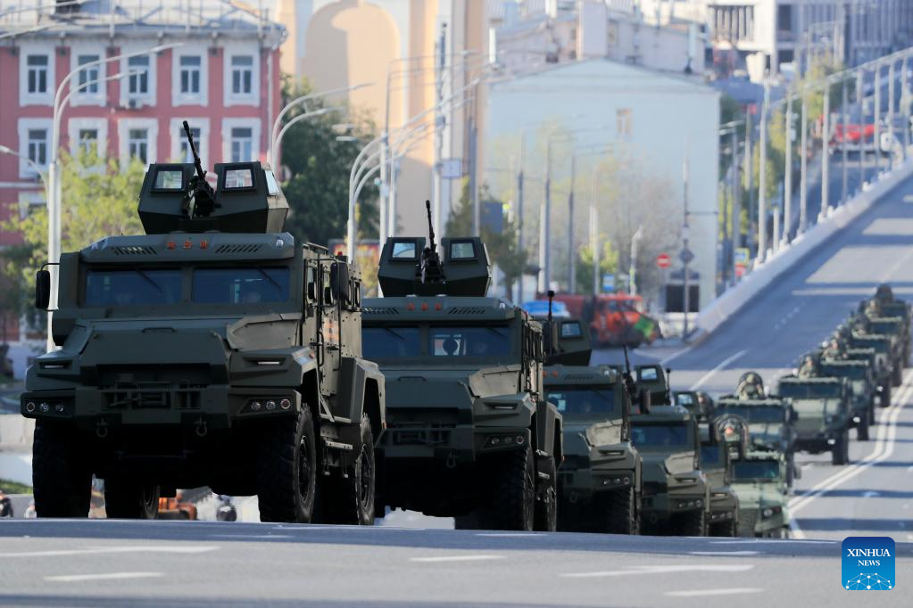 This photo taken on May 7, 2023 shows the armored vehicles before a rehearsal of the Victory Day military parade in Moscow, Russia. (Photo by Alexander Zemlianichenko Jr/Xinhua)