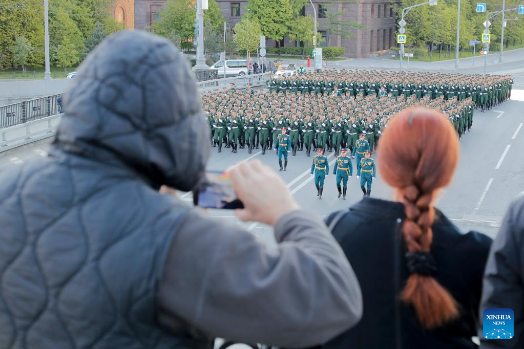 People watch a rehearsal of the Victory Day military parade in Moscow, Russia, May 7, 2023. (Photo by Alexander Zemlianichenko Jr/Xinhua)
