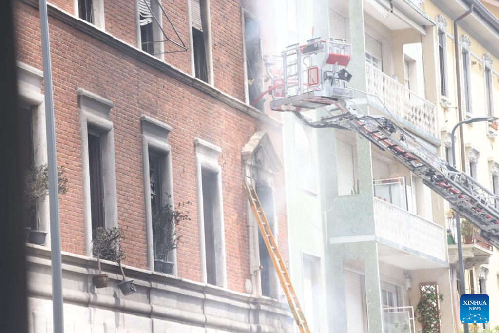 Firefighters work at the site of an explosion in Milan, Italy, May 11, 2023. At least one person was injured after a violent explosion occurred in the center of Milan, Italy on Thursday, local media reported. (Str/Xinhua)