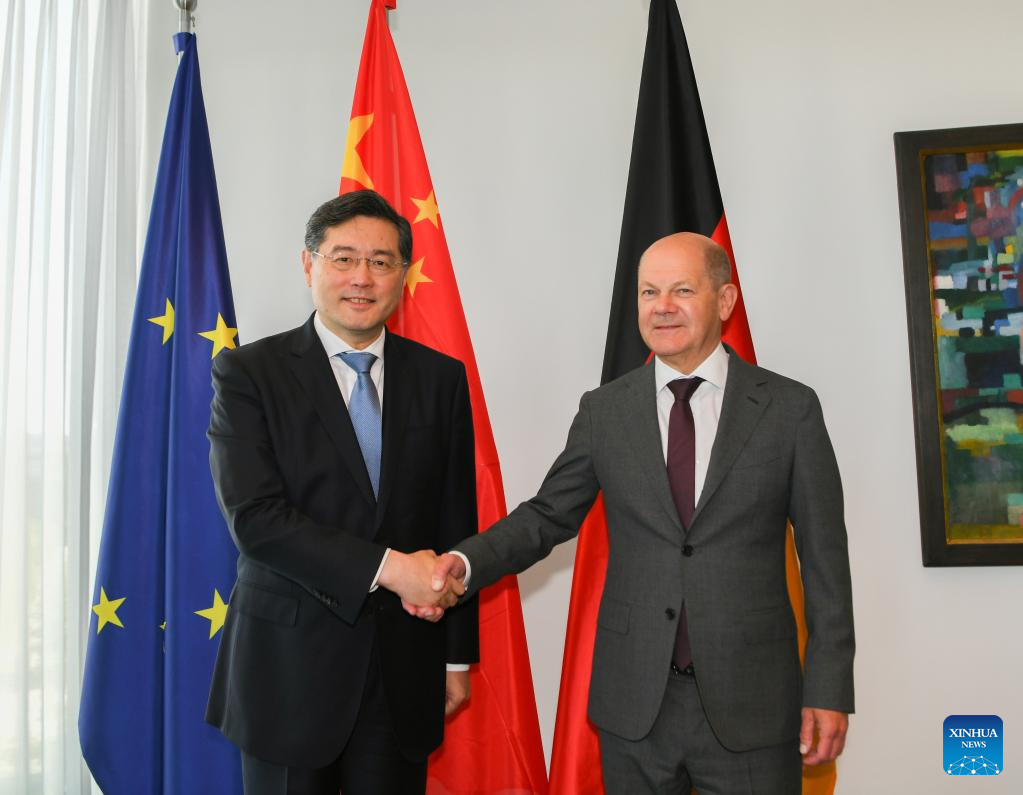 German Chancellor Olaf Scholz (R) meets with Chinese State Councilor and Foreign Minister Qin Gang in Berlin, Germany, May 10, 2023. (Xinhua/Ren Pengfei)