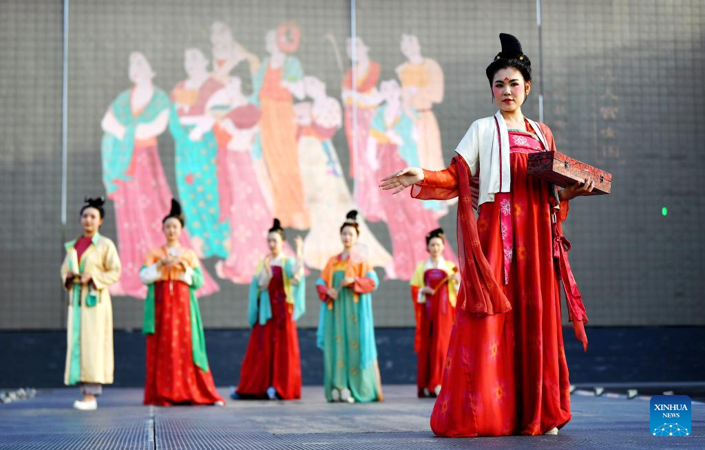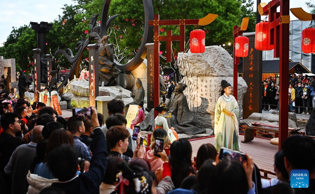 This photo taken on April 25, 2023 shows a traditional costume show at the Datang Everbright City scenic area in Xi'an, northwest China's Shaanxi Province. Xi'an, a city with over 3,100 years of history, served as the capital for 13 dynasties in Chinese history. It is also home to the world-renowned Terracotta warriors created in the Qin Dynasty (221-207 BC).