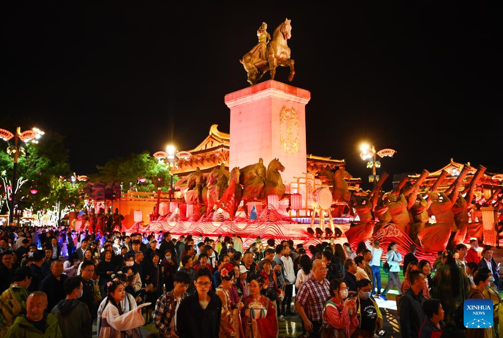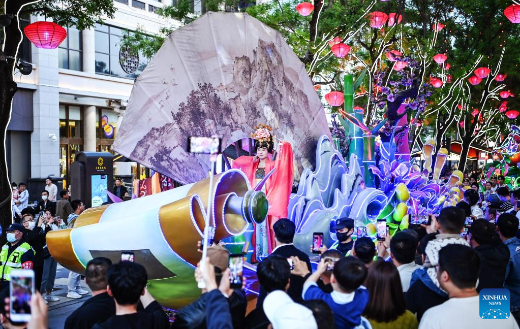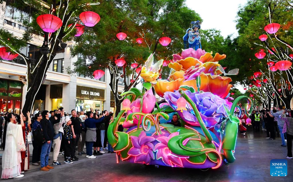 This photo taken on April 25, 2023 shows a float parade at the Datang Everbright City scenic area in Xi'an, northwest China's Shaanxi Province. Xi'an, a city with over 3,100 years of history, served as the capital for 13 dynasties in Chinese history. It is also home to the world-renowned Terracotta warriors created in the Qin Dynasty (221-207 BC).