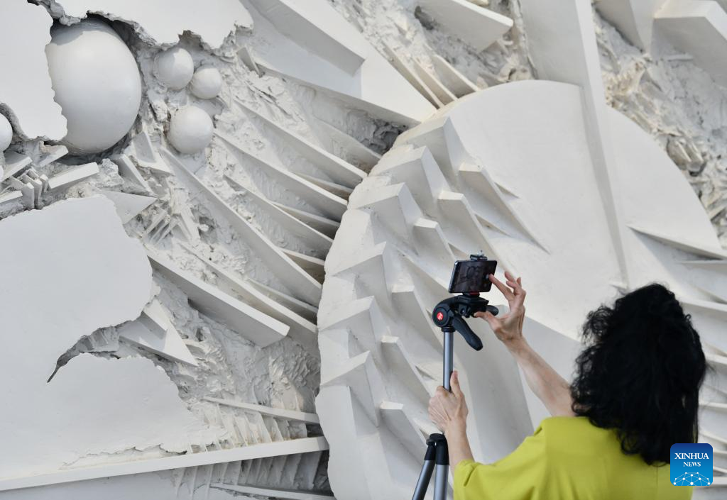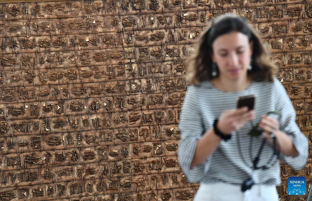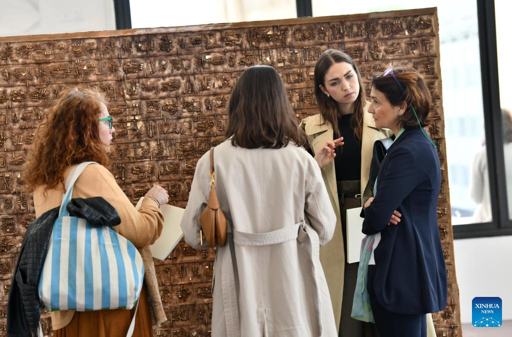 A woman takes photos during a media preview of the exhibition "The Great Theatre of Civilizations" at Fendi's headquarters in Rome, Italy, on May 11, 2023. The exhibition, running from May 12 to Oct. 1, displays approximately thirty works created by Italian contemporary sculptor Arnaldo Pomodoro between the late 1950s and 2021, together with a series of archival materials including photographs, documents, sketches and drawings. (Xinhua/Jin Mamengni)