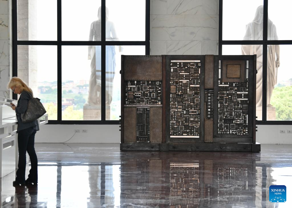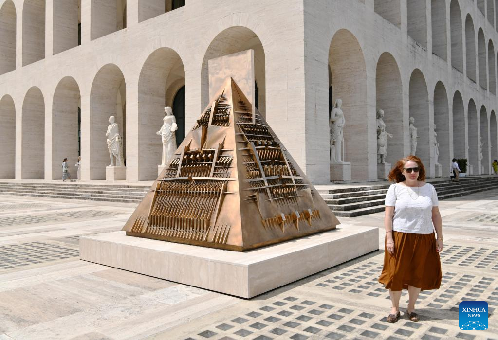 A woman walks past the sculpture "Continuum" during a media preview of the exhibition "The Great Theatre of Civilizations" at Fendi's headquarters in Rome, Italy, on May 11, 2023. The exhibition, running from May 12 to Oct. 1, displays approximately thirty works created by Italian contemporary sculptor Arnaldo Pomodoro between the late 1950s and 2021, together with a series of archival materials including photographs, documents, sketches and drawings. (Xinhua/Jin Mamengni)