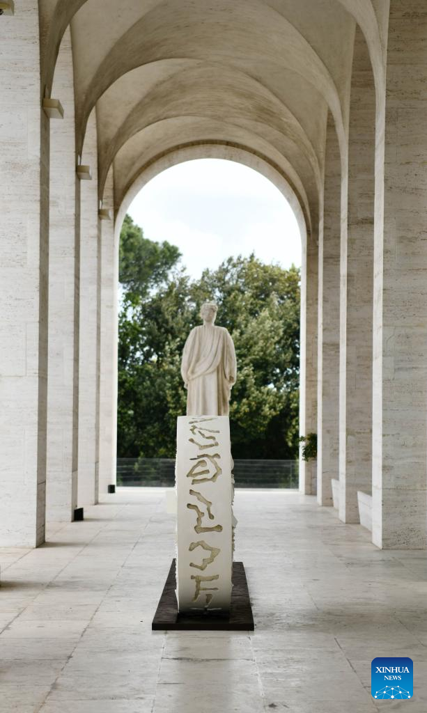 This photo taken on May 11, 2023 shows the sculpture "Il Potere" during a media preview of the exhibition "The Great Theatre of Civilizations" at Fendi's headquarters in Rome, Italy, on May 11, 2023. The exhibition, running from May 12 to Oct. 1, displays approximately thirty works created by Italian contemporary sculptor Arnaldo Pomodoro between the late 1950s and 2021, together with a series of archival materials including photographs, documents, sketches and drawings. (Xinhua/Jin Mamengni)