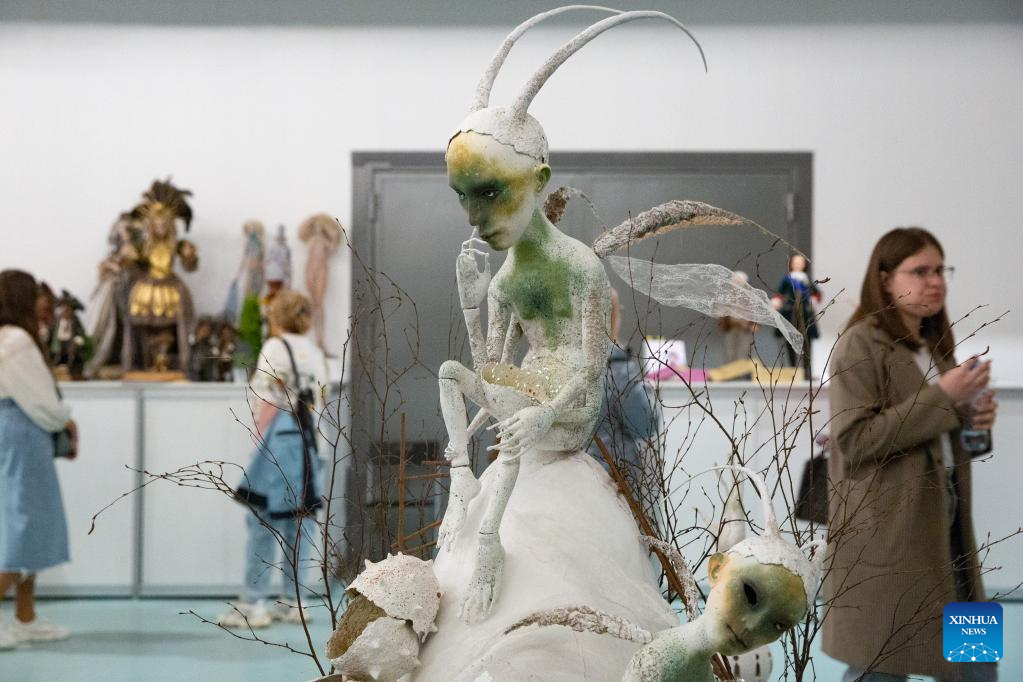People visit an international dolls exhibition in St. Petersburg, Russia, on May 12, 2023. A variety of handmade human and animal shaped dolls are exhibited at the international dolls exhibition here for four days starting from May 11, attracting more than 400 craftsmen from Russia and abroad. (Photo by Irina Motina/Xinhua)