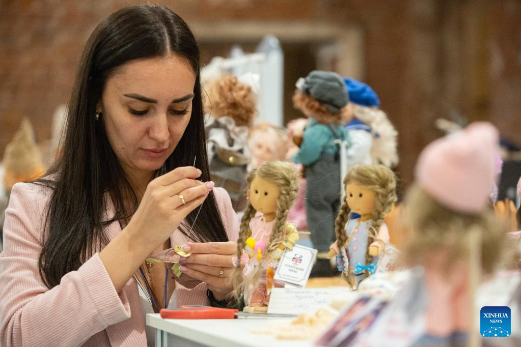 A woman works on a doll at an international dolls exhibition in St. Petersburg, Russia, on May 12, 2023. A variety of handmade human and animal shaped dolls are exhibited at the international dolls exhibition here for four days starting from May 11, attracting more than 400 craftsmen from Russia and abroad. (Photo by Irina Motina/Xinhua)