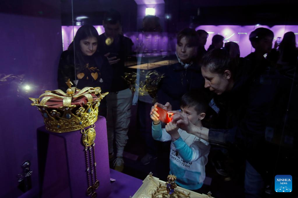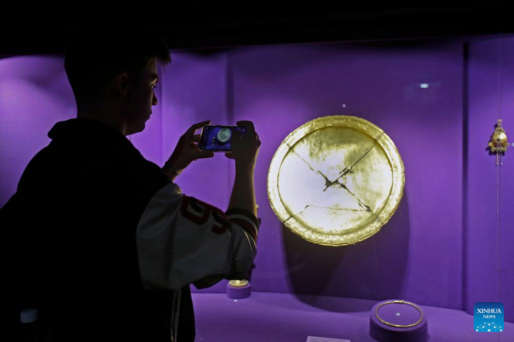 A visitor takes photo of exhibits at Romania's National History Museum which opens till late night as part of the European Night of Museums cultural initiative in downtown Bucharest, capital of Romania, May 13, 2023. (Photo by Cristian Cristel/Xinhua)