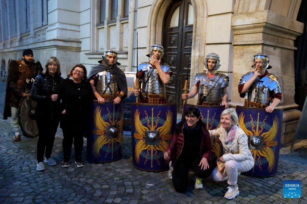 People pose with members of a history reenactment group dressed as Roman soldiers outside Romania's National History Museum which opens till late night as part of the European Night of Museums cultural initiative in downtown Bucharest, capital of Romania, May 13, 2023. (Photo by Cristian Cristel/Xinhua)