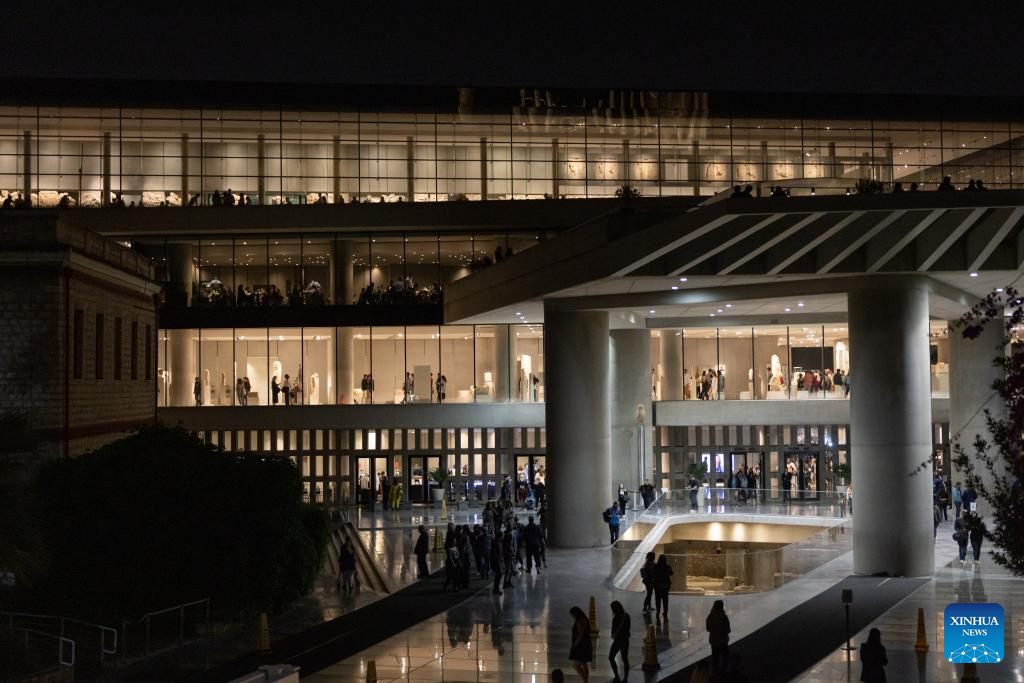 This photo taken on May 13, 2023 shows Acropolis Museum at night in Athens, Greece. Acropolis Museum participates in this year's European Night of Museums with extended opening hours until midnight and free entry. (Photo by Lefteris Partsalis/Xinhua)