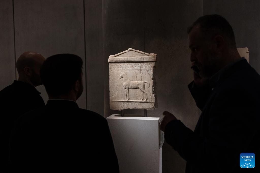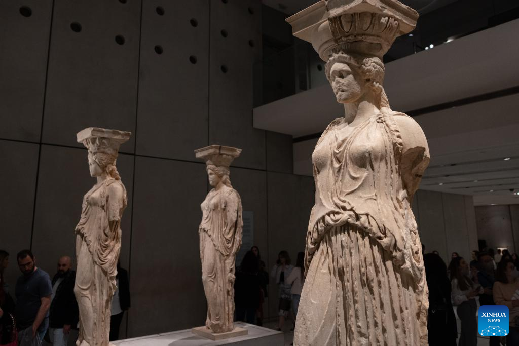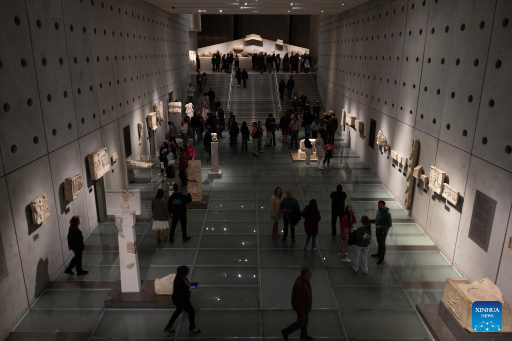 This photo taken on May 13, 2023 shows people watching the ancient masterpieces of museum collection at the Acropolis Museum in Athens, Greece. Acropolis Museum participates in this year's European Night of Museums with extended opening hours until midnight and free entry. (Photo by Lefteris Partsalis/Xinhua)