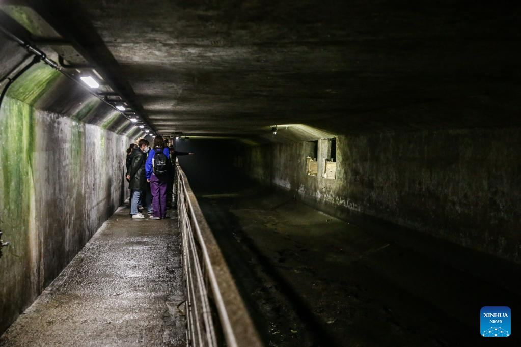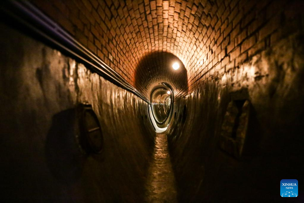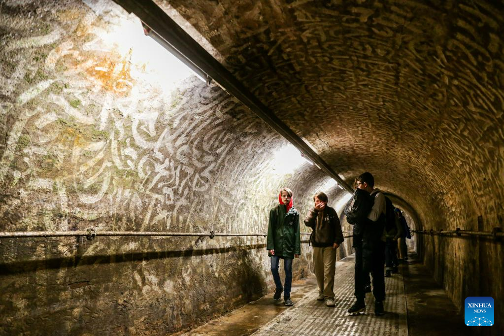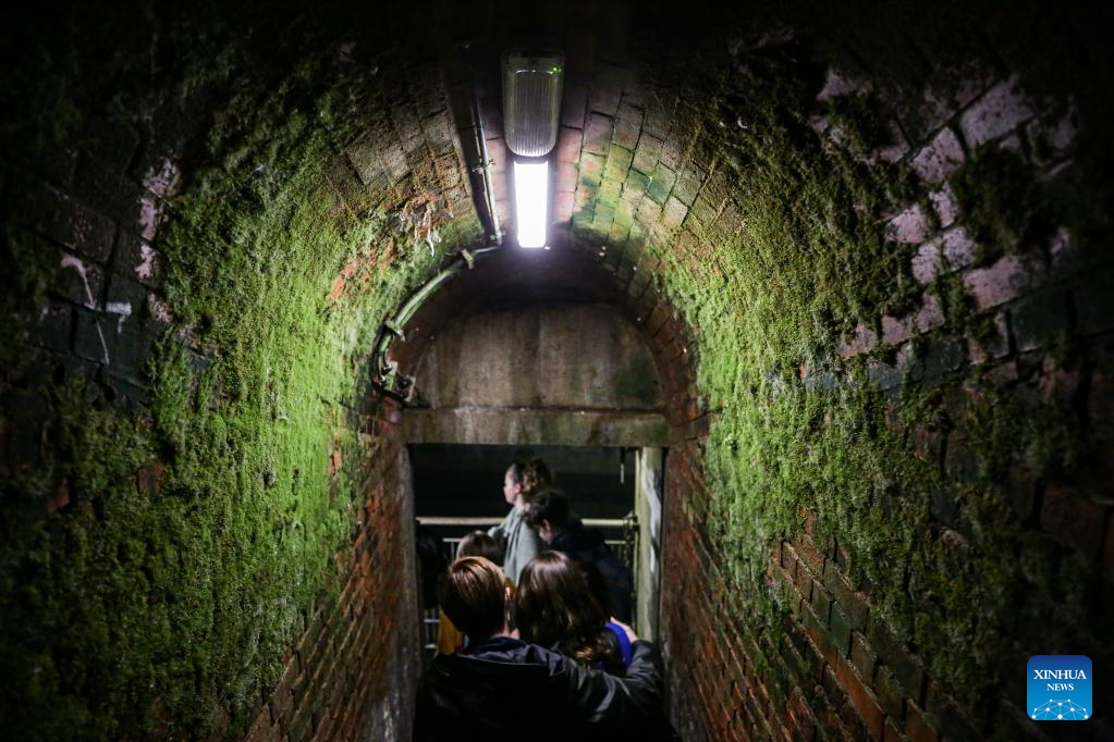 Visitors walk through a sewer at Sewer Museum in Brussels, Belgium, on May 16, 2023. Sewer Museum in Brussels shows history of the city's sewer system and water management. Visitors may get to experience the essential work of a sewage worker and the means used to combat flooding in the city through a real sewer in the museum. (Xinhua/Zheng Huansong)