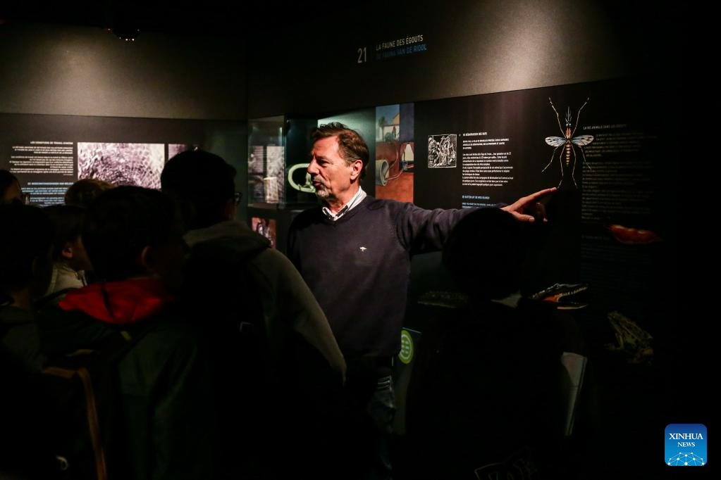 A guide introduces the environment of a sewer to visitors at Sewer Museum in Brussels, Belgium, on May 16, 2023. Sewer Museum in Brussels shows history of the city's sewer system and water management. Visitors may get to experience the essential work of a sewage worker and the means used to combat flooding in the city through a real sewer in the museum. (Xinhua/Zheng Huansong)