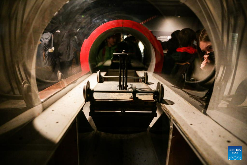 A visitor looks at a model used for cleaning a sewer at Sewer Museum in Brussels, Belgium, on May 16, 2023. Sewer Museum in Brussels shows history of the city's sewer system and water management. Visitors may get to experience the essential work of a sewage worker and the means used to combat flooding in the city through a real sewer in the museum. (Xinhua/Zheng Huansong)