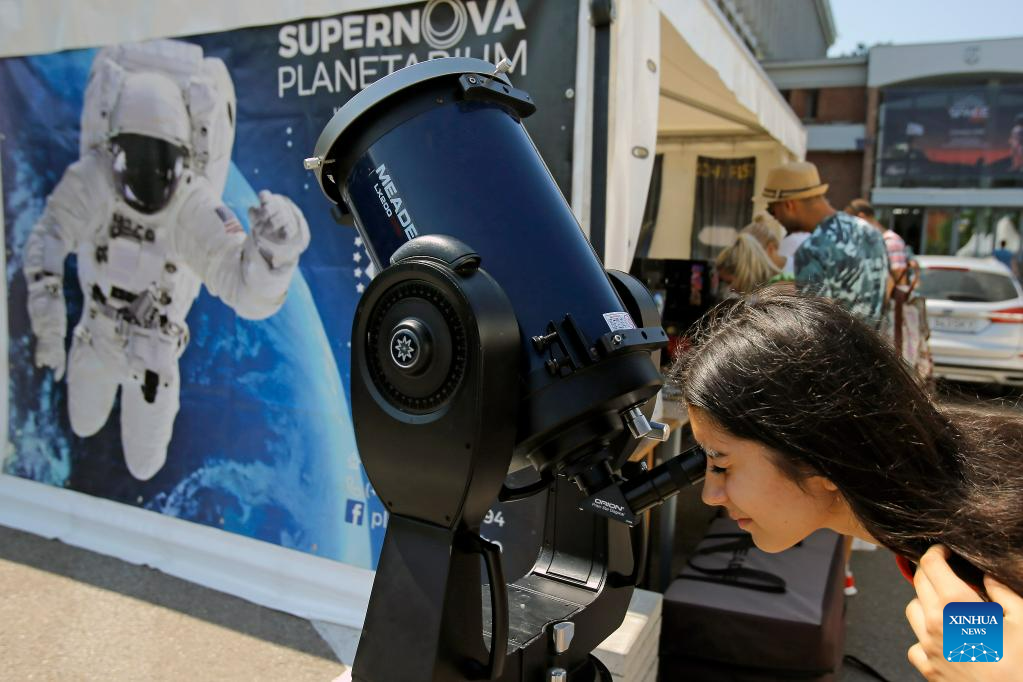 A visitor looks through a telescope at a technology exhibition in Politehnica University of Bucharest, Romania, June 11, 2023. (Photo by Cristian Cristel/Xinhua)