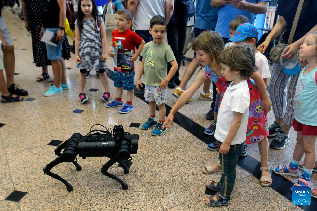 Children interact with a robotic dog at a technology exhibition in Politehnica University of Bucharest, Romania, June 11, 2023. (Photo by Cristian Cristel/Xinhua)