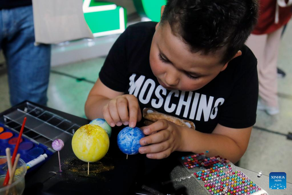 A child decorates painted spheres representing planets of the solar system at a technology exhibition in Politehnica University of Bucharest, Romania, June 11, 2023. (Photo by Cristian Cristel/Xinhua)