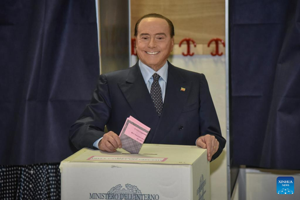 This file photo shows former Italian Prime Minister Silvio Berlusconi casting his ballot at a polling station in Milan, Italy, Sept. 25, 2022. Berlusconi died Monday at the age of 86 at the San Raffaele hospital in Milan, the press office of his political party Forza Italia confirmed. (Xinhua)