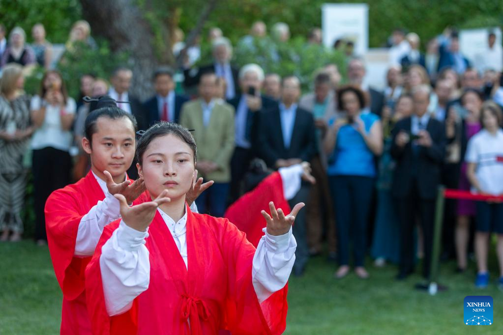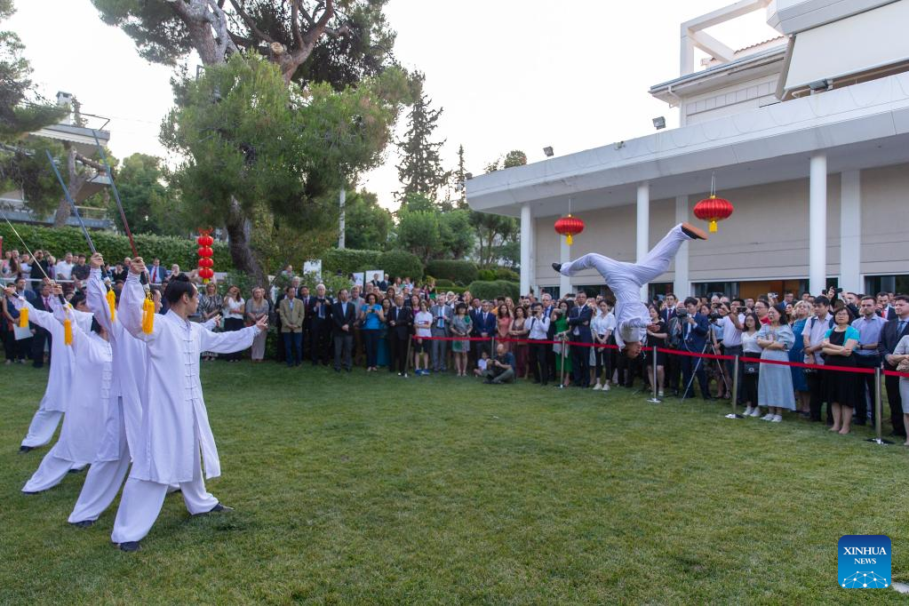 People watch a Taiji (Tai Chi) show at the Chinese embassy in Athens, Greece, on June 22, 2023. The China-Central and Eastern European Countries (CEECs) cooperation was celebrated at a reception held at the Chinese embassy in Athens on Thursday. (Xinhua/Marios Lolos)