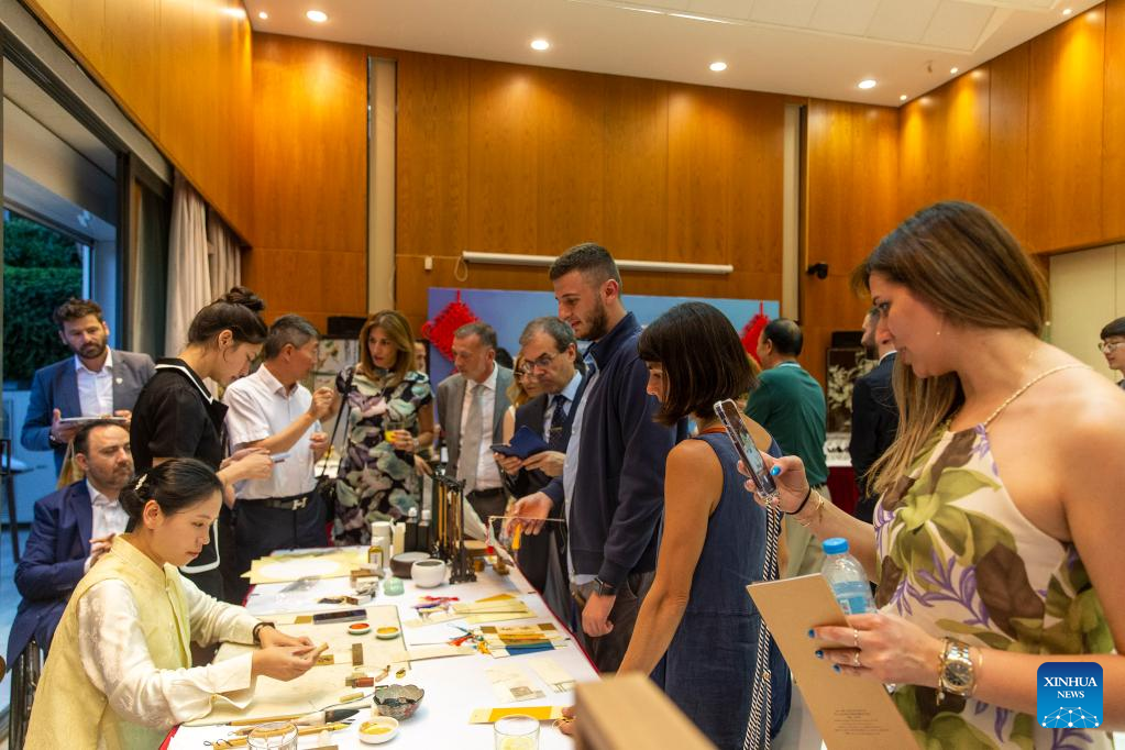 People watch a Chinese calligraphy demonstration at the Chinese embassy in Athens, Greece, on June 22, 2023. The China-Central and Eastern European Countries (CEECs) cooperation was celebrated at a reception held at the Chinese embassy in Athens on Thursday. (Xinhua/Marios Lolos)