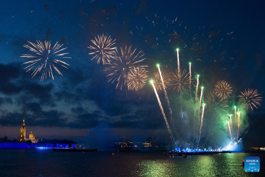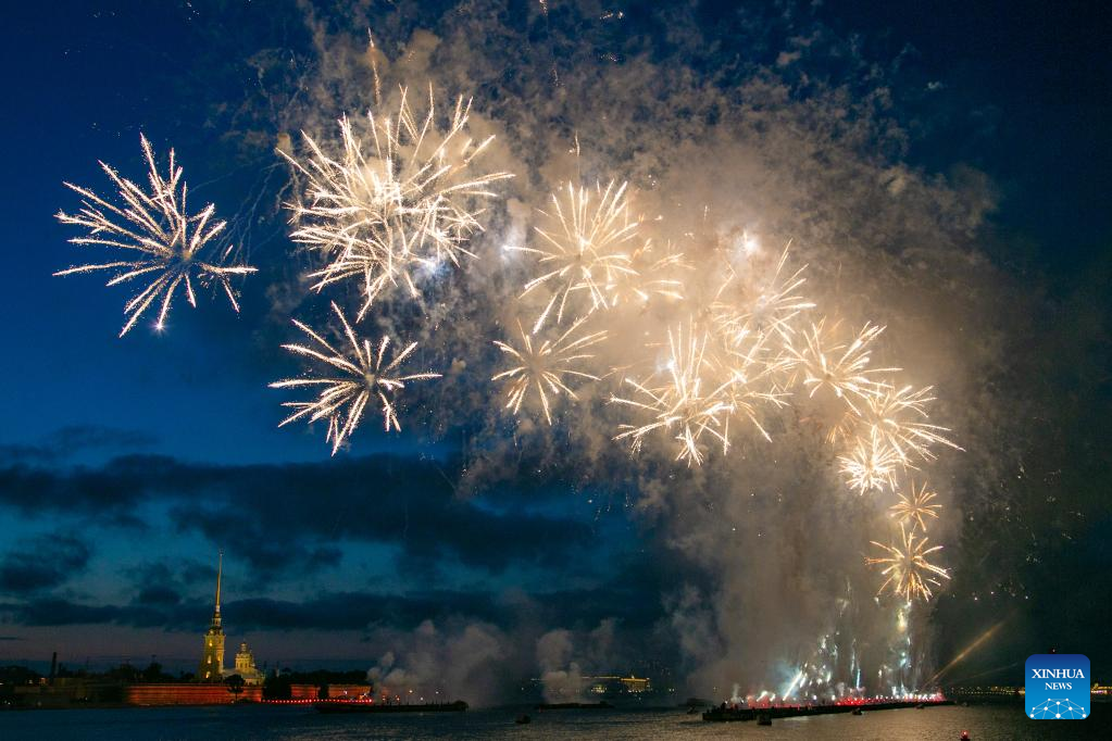 This photo taken on June 25, 2023 shows fireworks during the Scarlet Sails festival in St. Petersburg, Russia. The Scarlet Sails festival, commemorating school graduation for students, is held in St. Petersburg annually at the end of June. (Photo by Irina Motina/Xinhua)