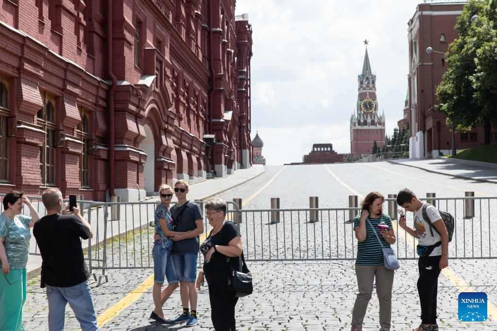 People take photos near the Red Square in Moscow, Russia, June 26, 2023. The legal regime of the counter-terrorist operation against the Wagner private military group has been canceled in Moscow and the Moscow region due to the normalization of the current situation, said the Russian government. (Xinhua/Bai Xueqi)