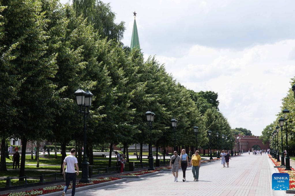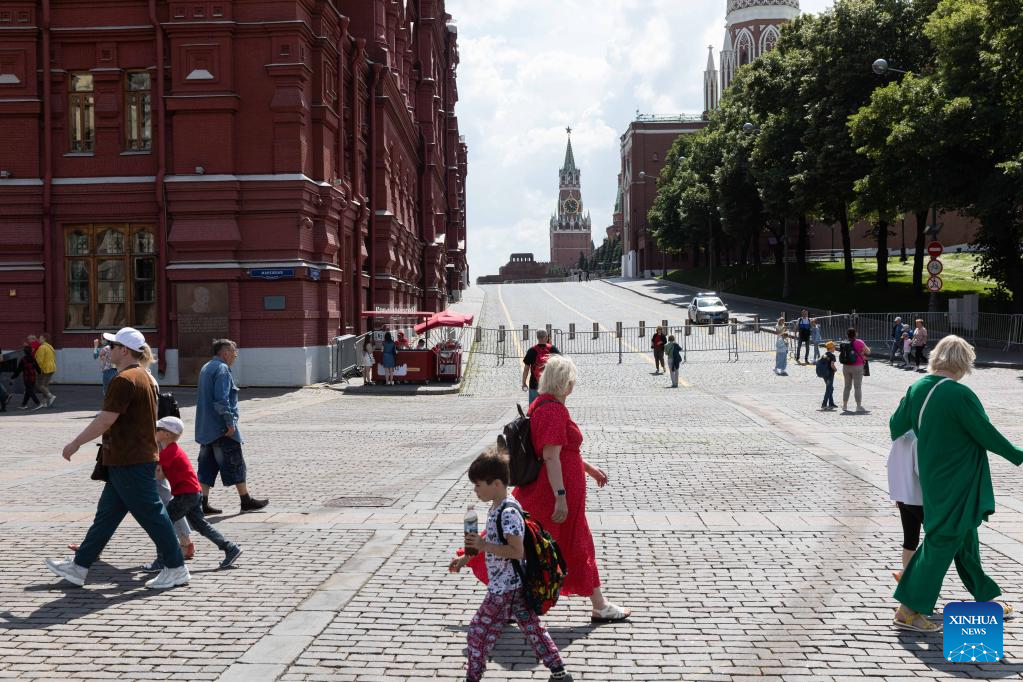 People walk near the Red Square in Moscow, Russia, June 26, 2023. The legal regime of the counter-terrorist operation against the Wagner private military group has been canceled in Moscow and the Moscow region due to the normalization of the current situation, said the Russian government. (Xinhua/Bai Xueqi)