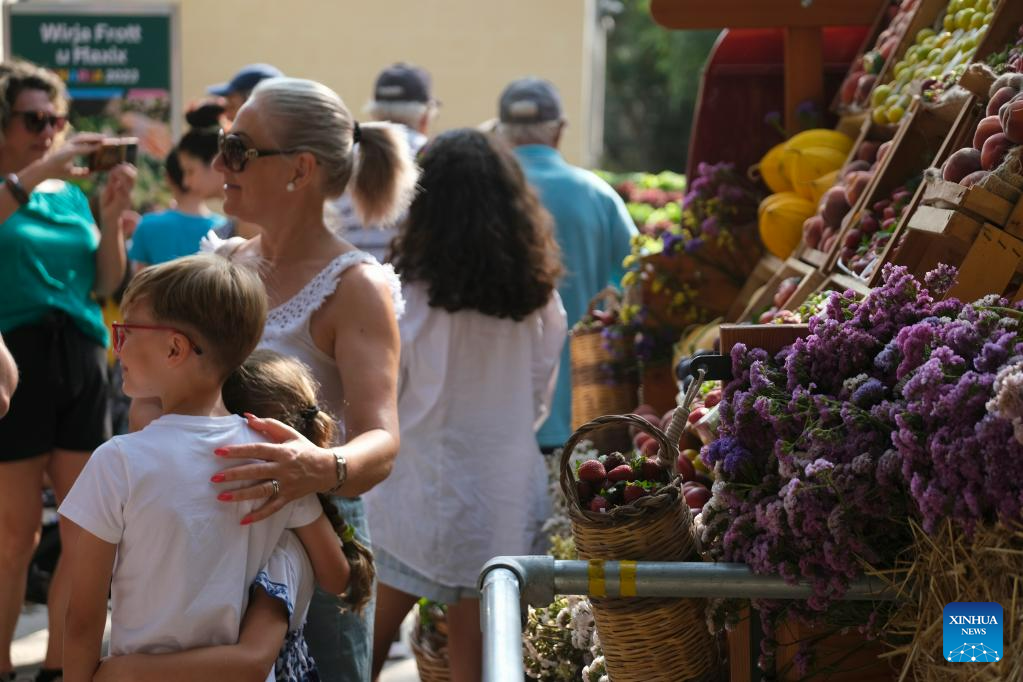 People pose for photos during the traditional festival of Mnarja in Buskett Gardens of Siggiewi, Malta, on June 29, 2023. A five-day traditional festival celebrating harvest was concluded on Thursday in Buskett Gardens of Malta. The event showcased agricultural products, livestock competitions and traditional folk music. The festival, named Mnarja in the Maltese language, is the principal folk festival of Malta. (Photo by Jonathan Borg/Xinhua)