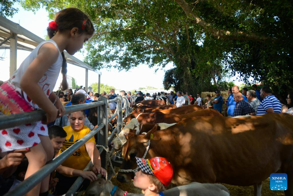 People stay together with cows during the traditional festival of Mnarja in Buskett Gardens of Siggiewi, Malta, on June 29, 2023. A five-day traditional festival celebrating harvest was concluded on Thursday in Buskett Gardens of Malta. The event showcased agricultural products, livestock competitions and traditional folk music. The festival, named Mnarja in the Maltese language, is the principal folk festival of Malta. (Photo by Jonathan Borg/Xinhua)