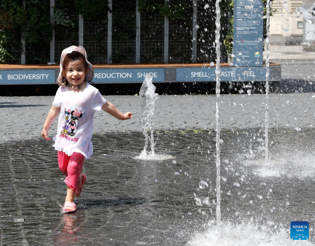 A girl plays at a fountain in Frankfurt, Germany, on July 8, 2023. (Xinhua/Zhang Fan)