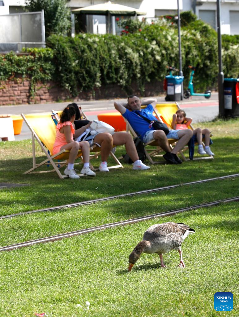 People rest on the lawn in Frankfurt, Germany, on July 8, 2023. (Xinhua/Zhang Fan)