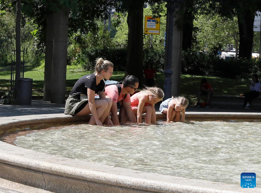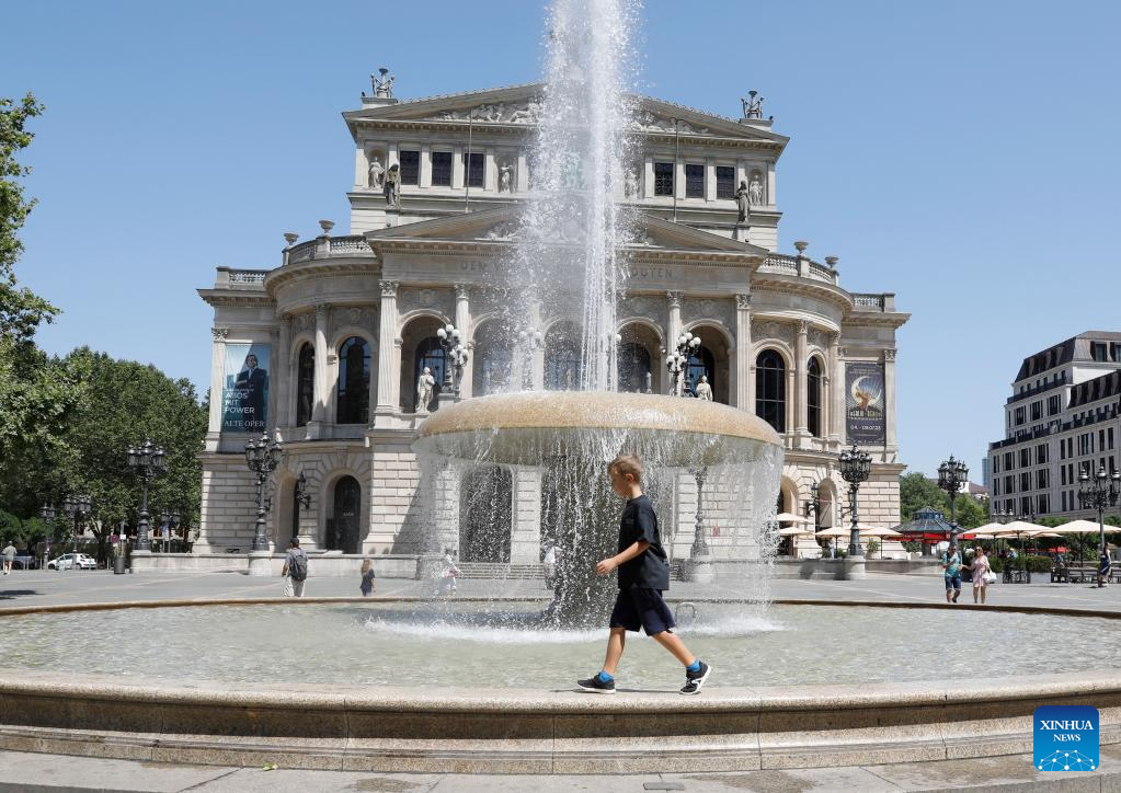 People cool themselves at a fountain in Frankfurt, Germany, on July 8, 2023. (Xinhua/Zhang Fan)