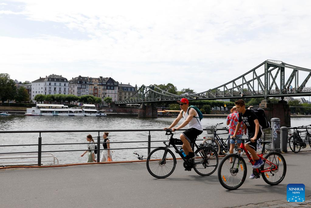 People ride bicycles in Frankfurt, Germany, on July 8, 2023. (Xinhua/Zhang Fan)