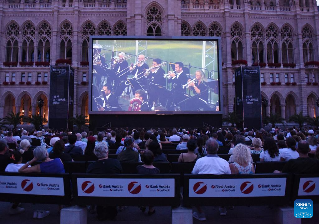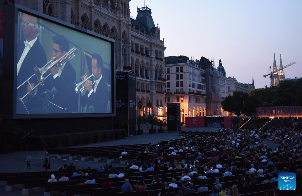 People watch a concert film during the 2023 Film Festival at Vienna's Rathausplatz, Austria, on July 9, 2023. This year's film festival at Vienna's Rathausplatz is held from July 1 to Sept. 3. (Xinhua/He Canling)