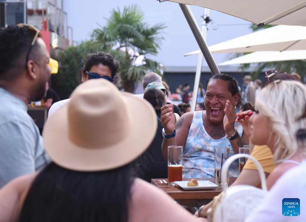 People enjoy food and drink during the 2023 Film Festival at Vienna's Rathausplatz, Austria, on July 9, 2023. This year's film festival at Vienna's Rathausplatz is held from July 1 to Sept. 3. (Xinhua/He Canling)