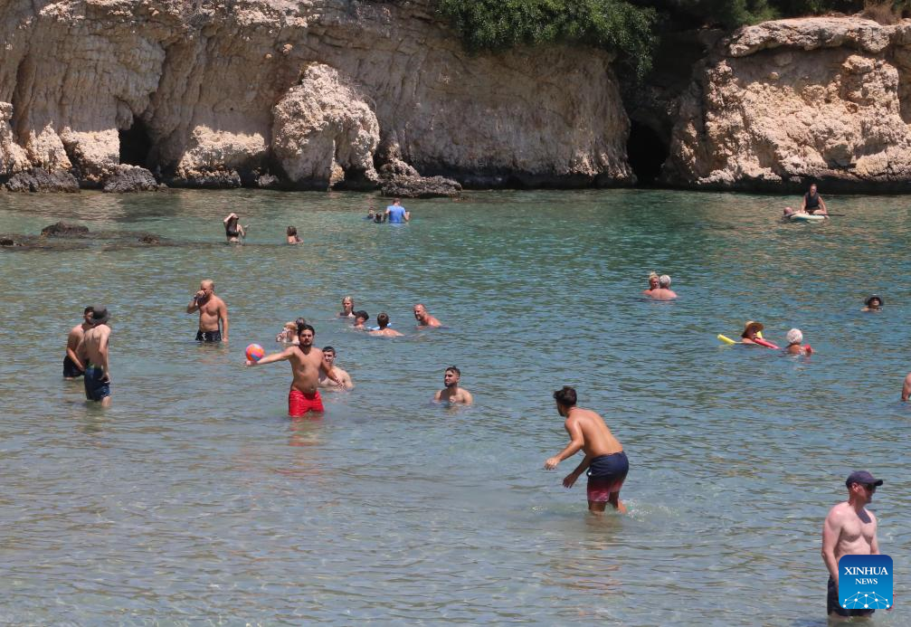 People cool themselves off at the seaside in Protaras, Cyprus, July 14, 2023. A heatwave that engulfed most of Europe earlier this week has now reached Cyprus, with 41 degrees Celsius being recorded in Nicosia, the country's meteorology service said on Thursday.