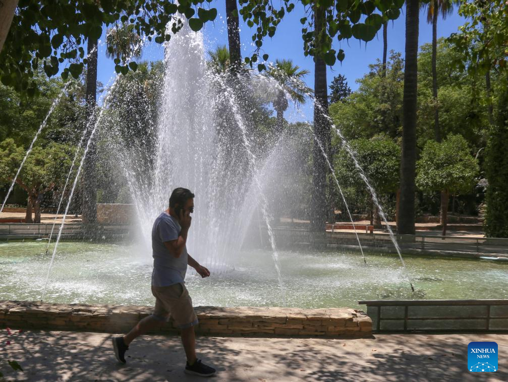 A man walks by a fountain at a park in Nicosia, Cyprus, July 14, 2023. A heatwave that engulfed most of Europe earlier this week has now reached Cyprus, with 41 degrees Celsius being recorded in Nicosia, the country's meteorology service said on Thursday.